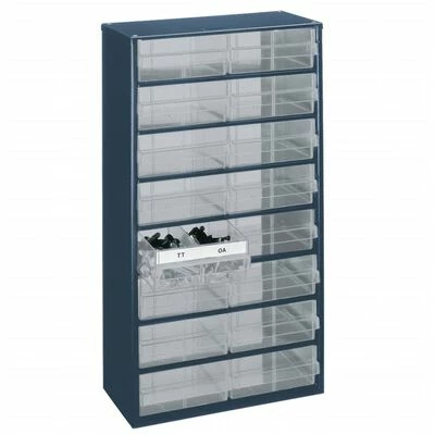 Elle est idéale pour conserver les composants de la machine, les écrous, les boulons, les clous et les vis ou autres accessoires. Cette armoire durable peut contenir 16 tiroirs. Chaque tiroir, en polypropylène, peut être divisé en 4 compartiments. Les diviseurs ne sont pas inclus dans la livraison.