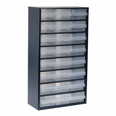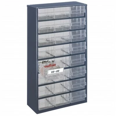 Elle est idéale pour conserver les composants de la machine, les écrous, les boulons, les clous et les vis ou autres accessoires. Cette armoire durable peut contenir 24 tiroirs. Chaque tiroir, en polypropylène, peut être divisé en 3 compartiments. Les diviseurs ne sont pas inclus dans la livraison.