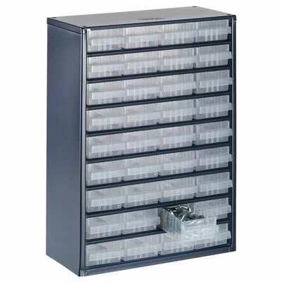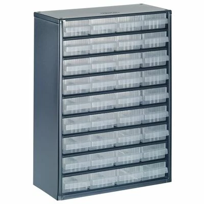 Elle est idéale pour conserver les composants de la machine, les écrous, les boulons, les clous et les vis ou autres accessoires. Cette armoire durable peut contenir 36 tiroirs. Chaque tiroir, en polypropylène, peut être divisé en 16 compartiments. Les diviseurs ne sont pas inclus dans la livraison.
