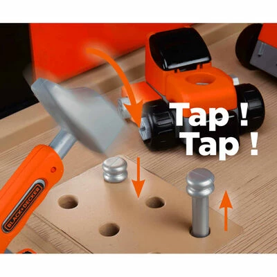 En tant que fonction spéciale, vous pouvez télécharger gratuitement l’application d’apprentissage pour les appareils Android et iOS. Cette application adaptée aux enfants permet aux enfants d’explorer le monde numérique par le jeu, en les aidant à en apprendre davantage sur les différents outils et leurs fonctions. Le grand et extrêmement robuste établi de jouet BLACK+DECKER ressemble à une véritable imitation du grand établi du papa !