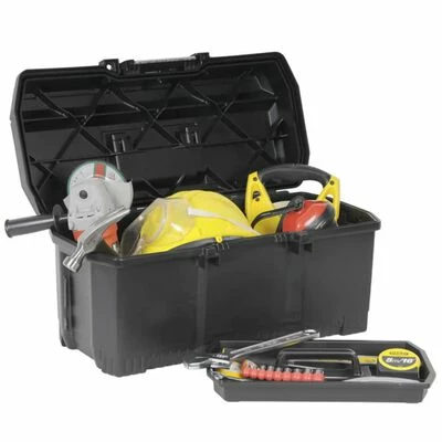 Cette boîte à outil d’une large capacité et un plateau amovible est un excellent organisateur pour vos outils. Elle est faite en plastique durable et est portable. Avec le poussoir à verrouillage, vos outils sont gardés en sécurité à l’intérieur. La rainure en V dans le couvercle vous aidera à avoir la coupe parfaite sur les tuyaux et le bois lorsqu’il n’ya pas de banc de travail.
