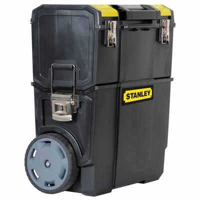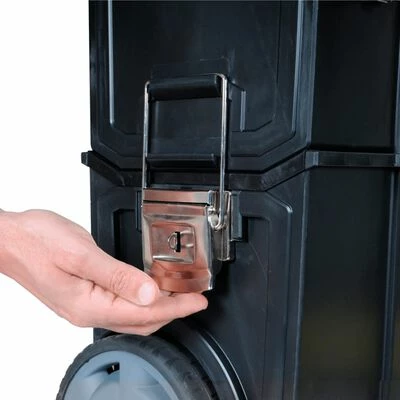 Cette boîte sur roulettes est dotée d’une boîte à outils amovible avec un petit compartiment de rangement pour les petites pièces sur le couvercle et une section médiane amovible pour les petites pièces et accessoires. Un plateau amovible est également disponible pour des outils essentiels. Le bac inférieur est doté de grandes roues de 18 cm et la poignée de transport sur le dessus permet une maniabilité facile et pratique. Des grands verrous métalliques sont utilisés pour relier les unités.
