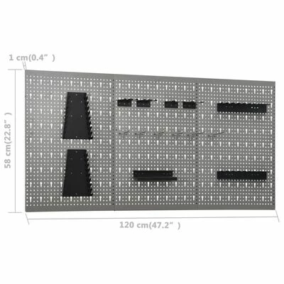 Ces panneaux à outils sont fabriqués en acier massif pour supporter le poids de divers outils, comme les perceuses, les pinces, les tournevis et les clés. Les panneaux sont perforés pour fixer les outils facilement et en toute sécurité. Les 3 panneaux muraux peuvent être fixés ensemble pour plus de rigidité. C’est un complément idéal à votre établi et à vos armoires d’atelier avec une largeur pratique de 120 cm.